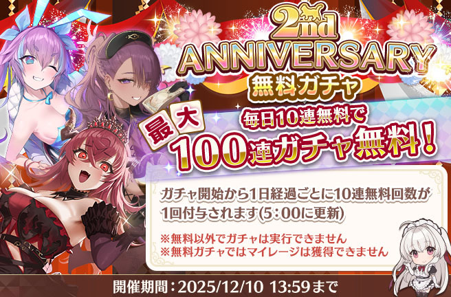 2周年を記念して最大100連の無料ガチャを開催中です。
