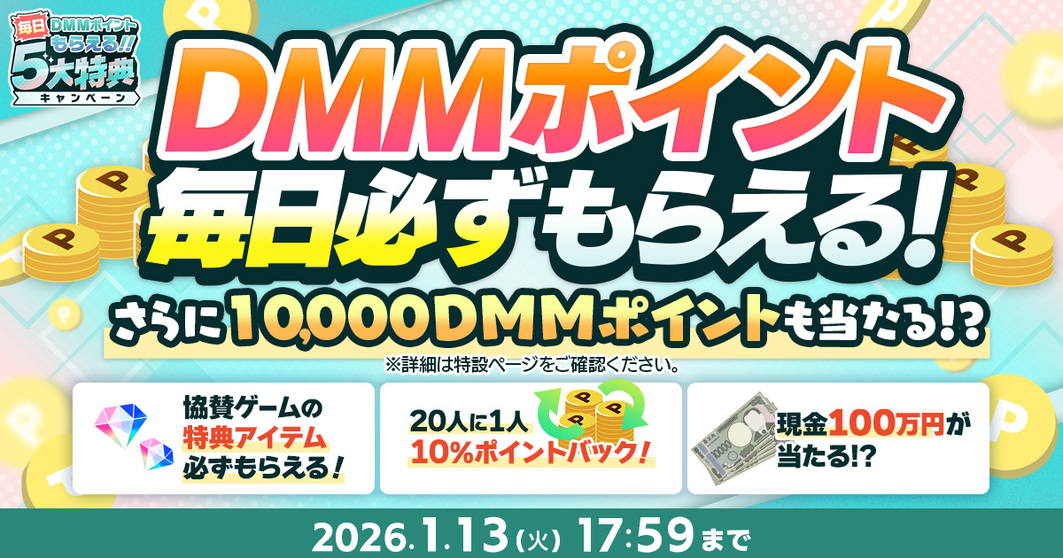 【キャンペーン1】毎日DMMポイントがもらえる&現金100万円が当たるチャンス!