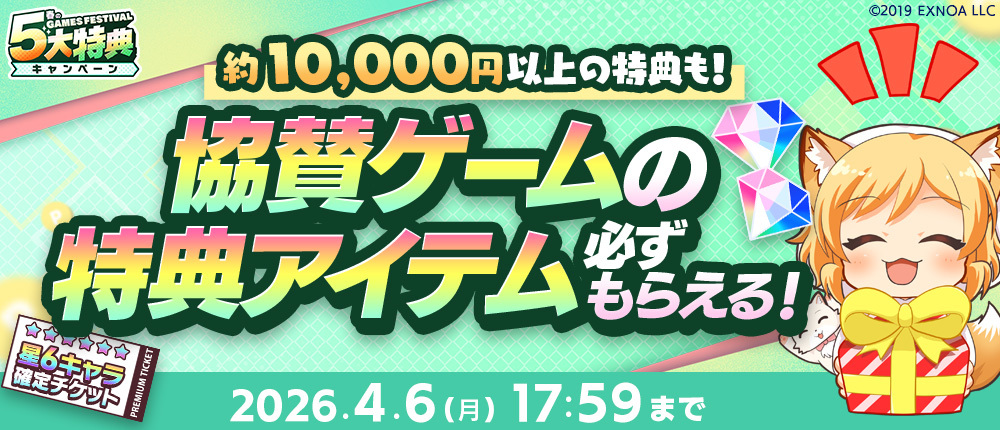 期間中、協賛ゲームをプレイするとプレイしたゲーム内で使える「10連ガチャチケット」や「レアキャラ確定チケット」など、豪華特典アイテムをもれなくプレゼントします。