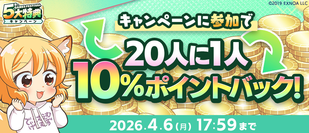 期間中、キャンペーンに参加してDMM GAMESでDMMポイントを消費すると、抽選で20人に1人へ10%分のポイントが還元されます。