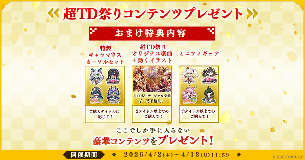 「第七回超TD祭りパック」を期間中に購入すると、カーソルが可愛いドットのキャラクターに変わる「特製キャラマウスカーソル」や、第七回TD祭り「TD祭りオリジナル楽曲フル音源データ」と「動くイラスト」など豪華オリジナルコンテンツが購入したタイトル数に応じてもれなく受け取れます!